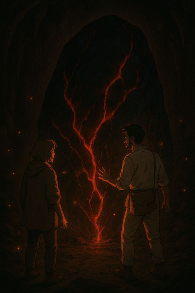 L’unica luce a guidarli era il richiamo della Pietra, sempre più forte. Oltrepassarono l’altare e con le picozze, raccolte da terra distrussero una porta di pietra sigillata, posta dietro l’altare. Si trovarono così di fronte a una grande pietra nera, con venature rosse come il fuoco, emanando una luce sinistra che pervase la stanza.